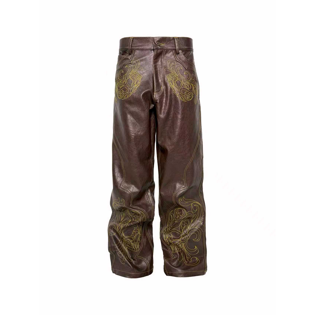 PCCVISION Gothic Skull Stitch PU Pants Brown