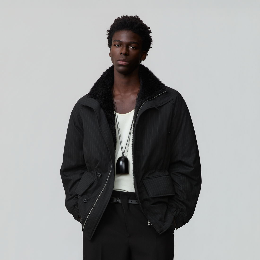 This piece merges classic bomber silhouette with unapologetic edge, embodying a bold winter statement. Structured...