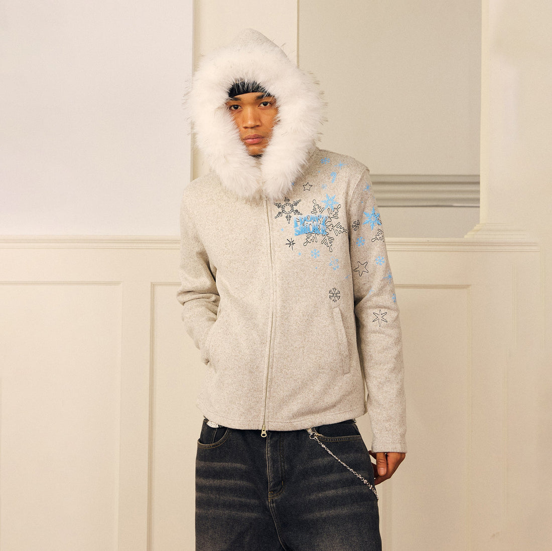 DONSMOKE Snowflake Embroidered Fleece-Lined Zip-Up Hoodie