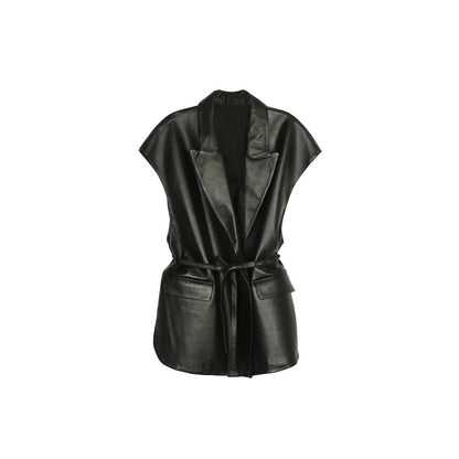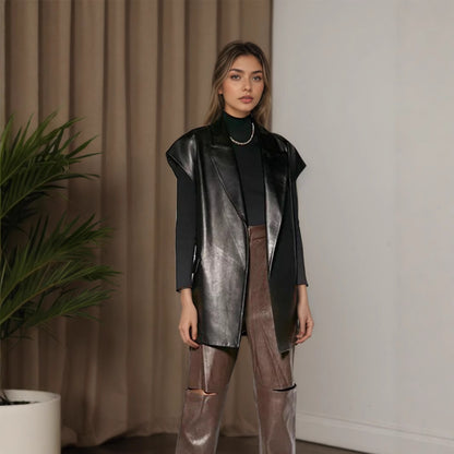 Fashionable Sleeveless Faux Leather Vest with Notched Lapel