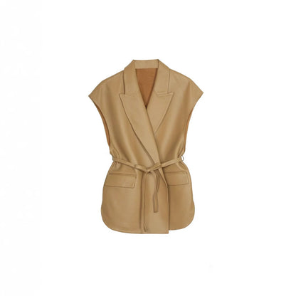 Upgrade your wardrobe with this stylish sleeveless leather vest, designed to elevate any outfit. Featuring a sharp notched lapel collar, this vest exudes sophistication. The adjustable waist tie belt ensures a flattering, tailored fit, while the dual front pockets add both functionality and a modern edge.