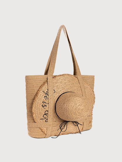 Versatile Pairing: The wide-brim hat and spacious tote complement any vacation outfit.