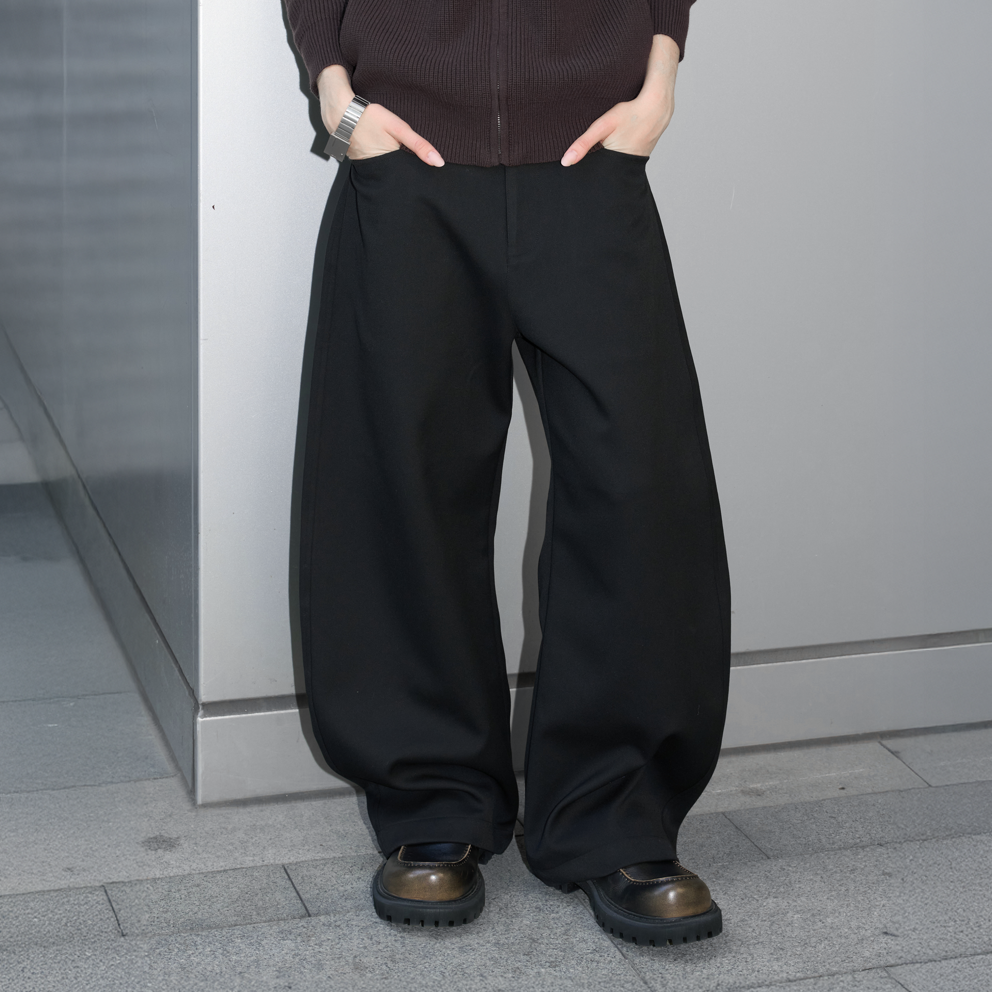 - Barrel-shaped wide leg construction