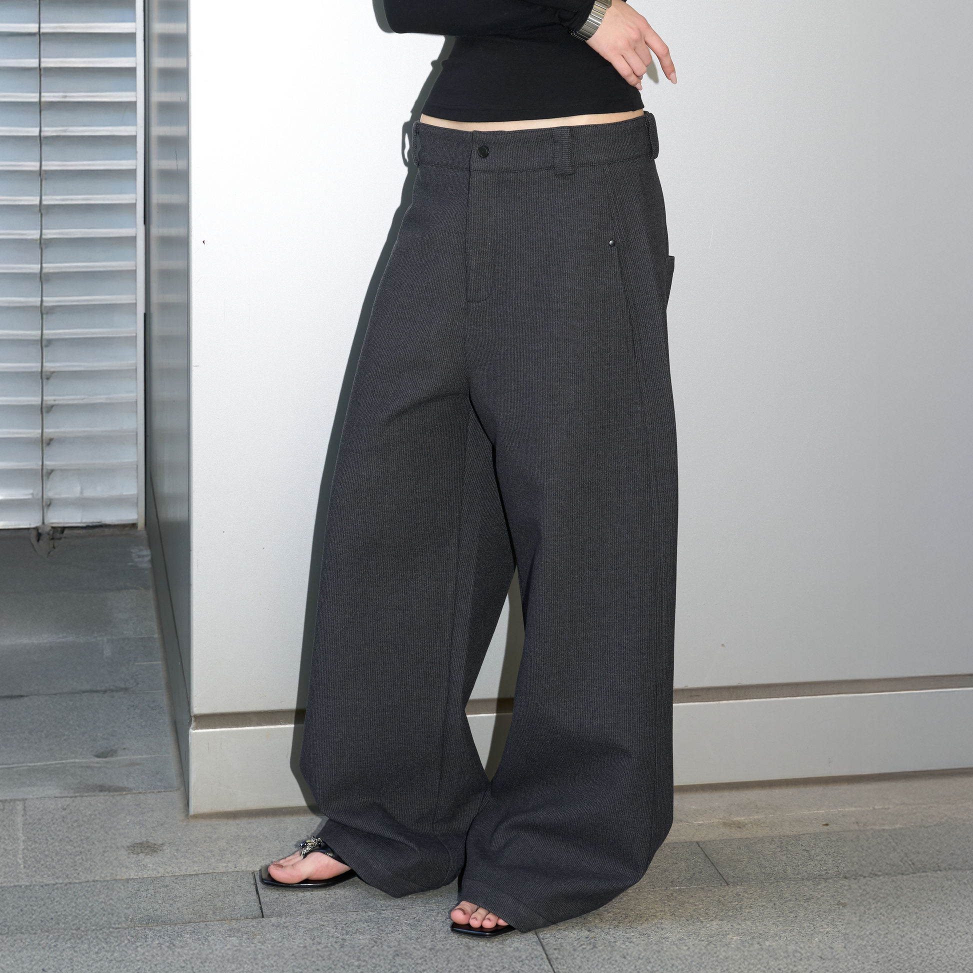 Pincheck Oversized Trousers present a sharp balance between architectural structure and relaxed silhouette, crafted in a deep charcoal tone with subtle pincheck texture. These trousers lean into a wide-leg profile, grounded by precise tailoring details and a clean mid-rise waist. Utility-forward patch pockets and subtle metallic rivets nod to workwear influences, while the dropped belt loops and extended length channel a directional, street-driven edge. This piece anchors both minimalist and experimental styling with equal ease.