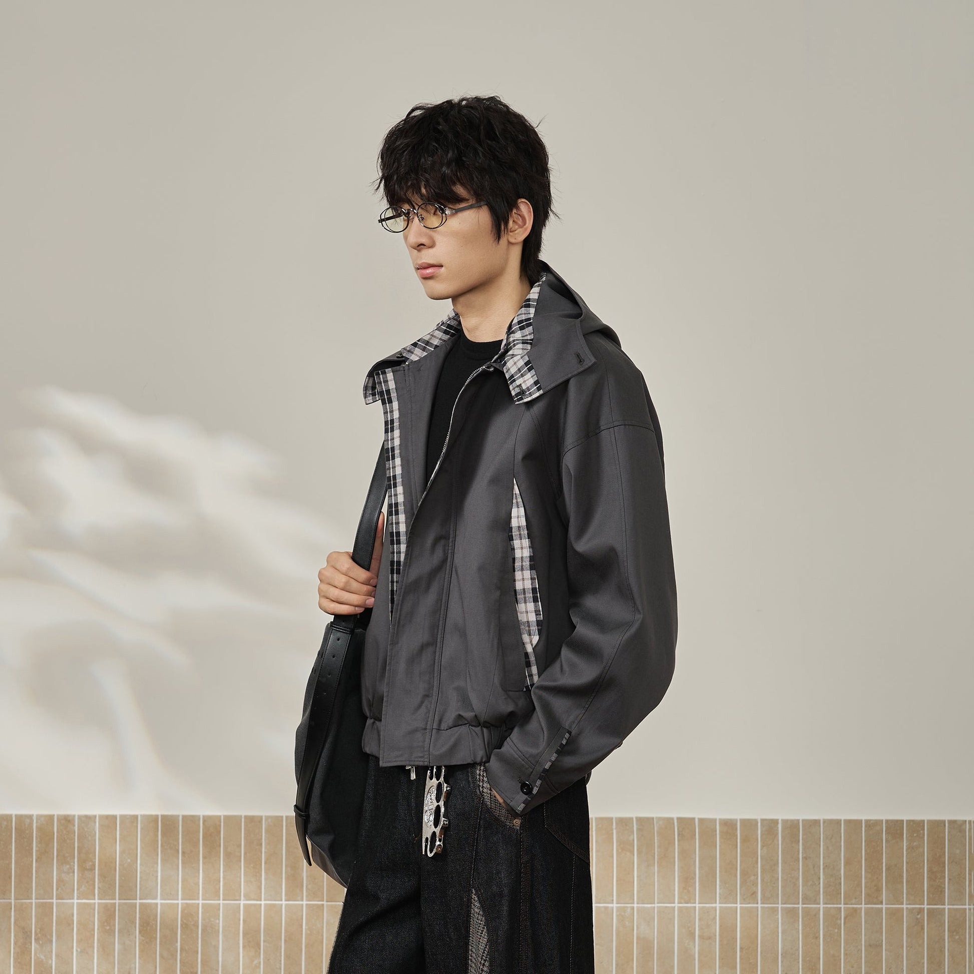 MOITIEDEPETALE Convertible Collar & Hood Plaid Pocket Jacket