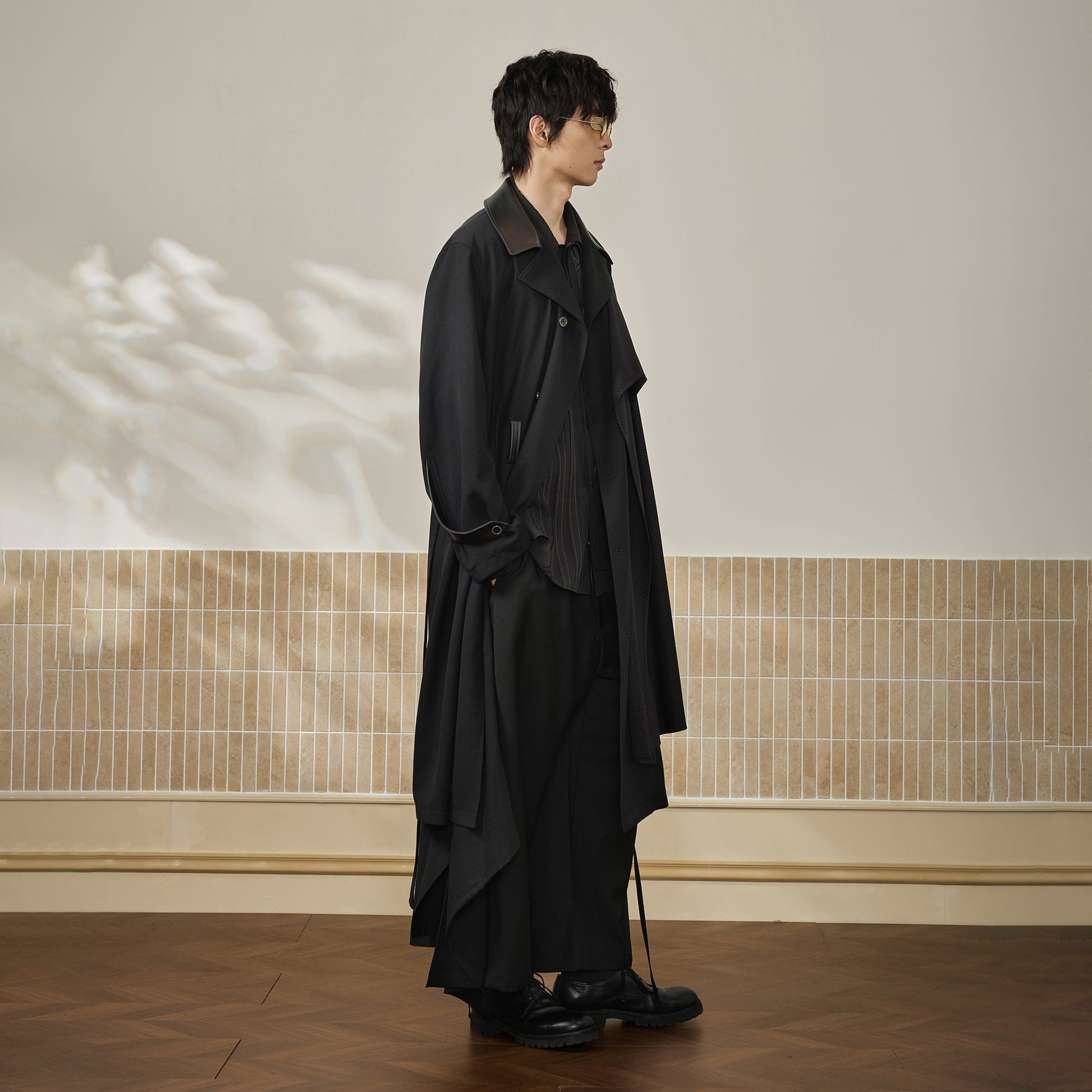 The Leather Paneled Belted Oversized Trench reimagines the traditional trench coat through a lens of avant-garde tailoring and layered materiality. Constructed in a voluminous silhouette, the piece combines flowing fabric with structured leather panels at the collar and shoulders for a hybrid contrast of texture. An integrated fabric belt cinches the waist subtly, while the longline cut and wide lapels contribute to its dramatic presence. Designed for fluid movement and elevated layering, this trench bridges modern tailoring with statement outerwear.
