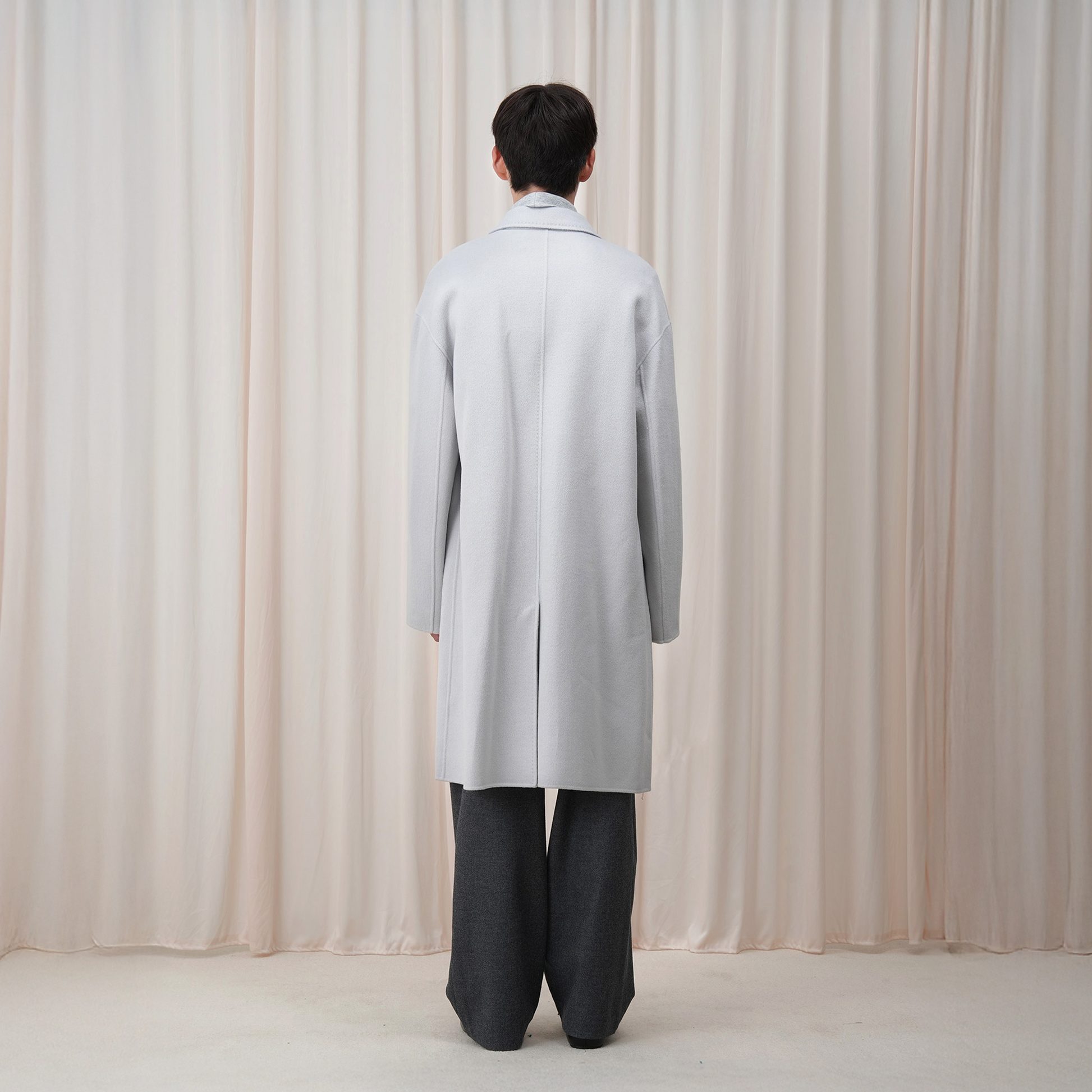 The Minimal Wool Oversized Coat softens classic tailoring with a pale palette and expanded silhouette. Crafted from structured wool melton, the coat maintains a clean profile with dropped shoulders, a straight body, and a mid-thigh length. Functional flap pockets and a simple five-button front offer quiet utility, while the light tone introduces a fresh neutrality to cold-weather outerwear. Designed with restraint, the piece balances volume and clarity with ease.