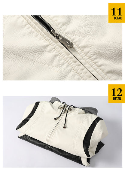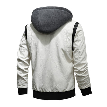 Plus-Size Men's Faux Leather Jacket with Stand Collar & Knit Hood