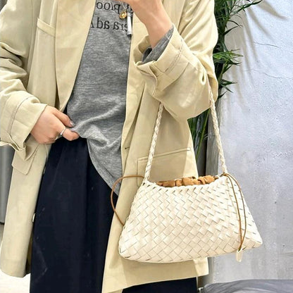 Chic Design: Unique woven texture, structured silhouette, and a sleek gold-tone or antique brass hardware accent.
