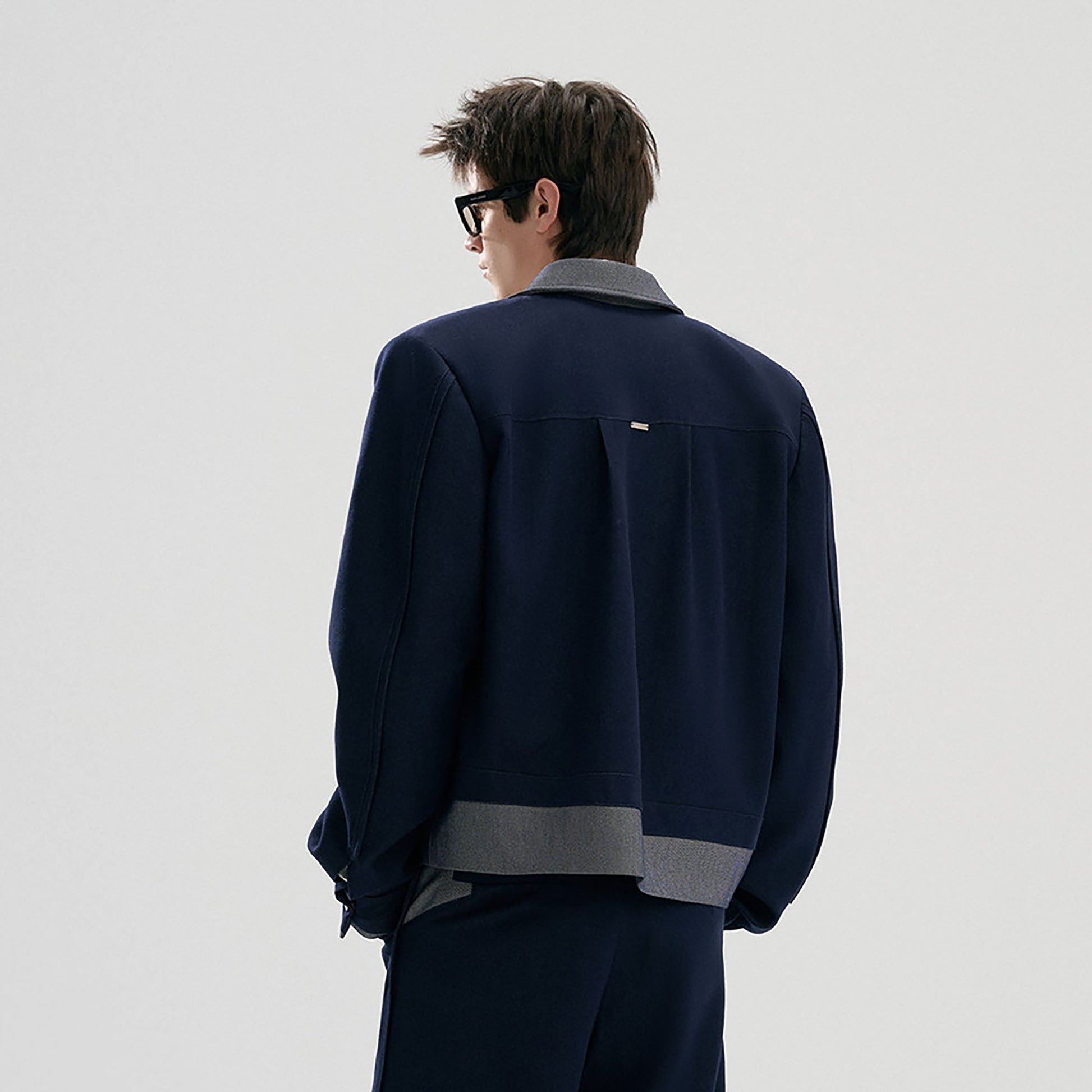 Refined through contrast and proportion, this jacket brings tailored sensibility into a modern, layered context. A cropped silhouette anchors the design, while contrasting panels at the collar and hem introduce subtle depth and visual separation. Clean lines and restrained detailing keep the look sharp, elevated by a smooth zip-front closure that reinforces its structured feel. The overall composition balances classic tailoring with contemporary edge, resulting in a piece that feels intentional and quietly expressive.