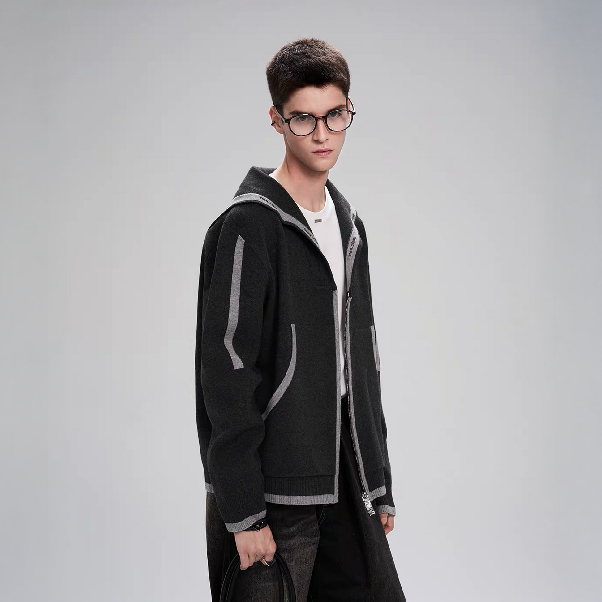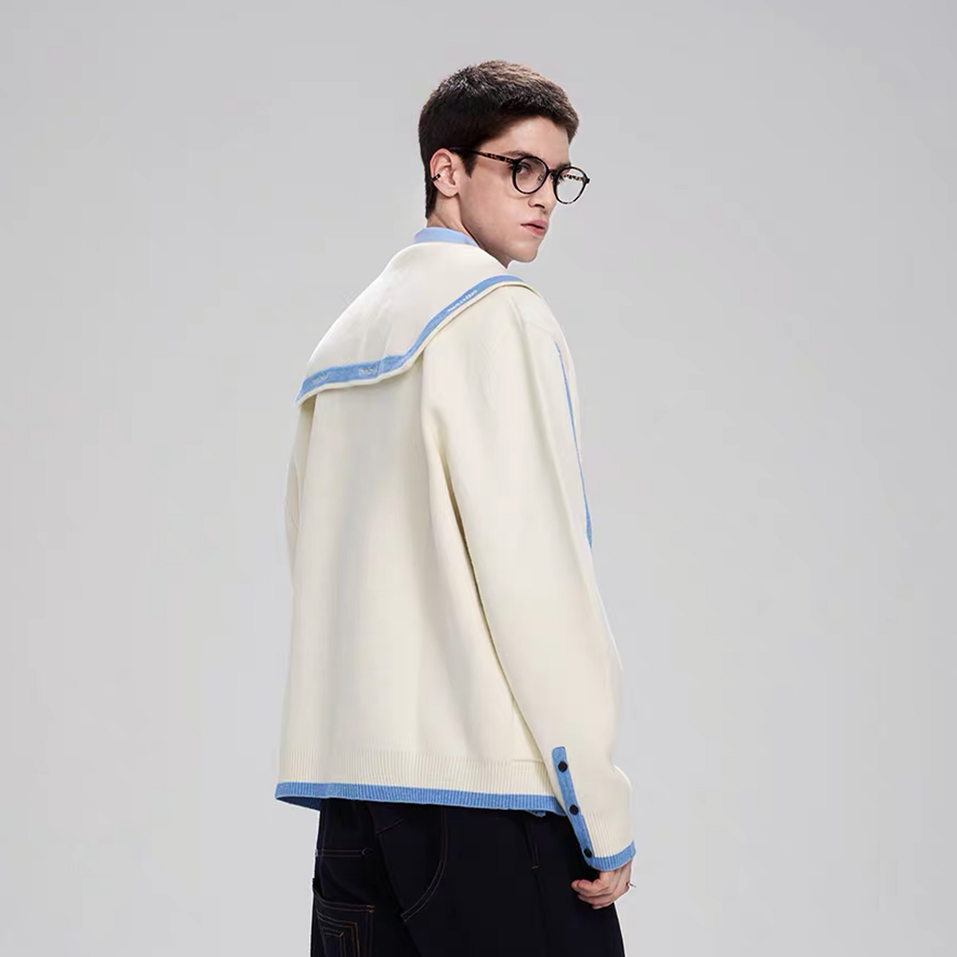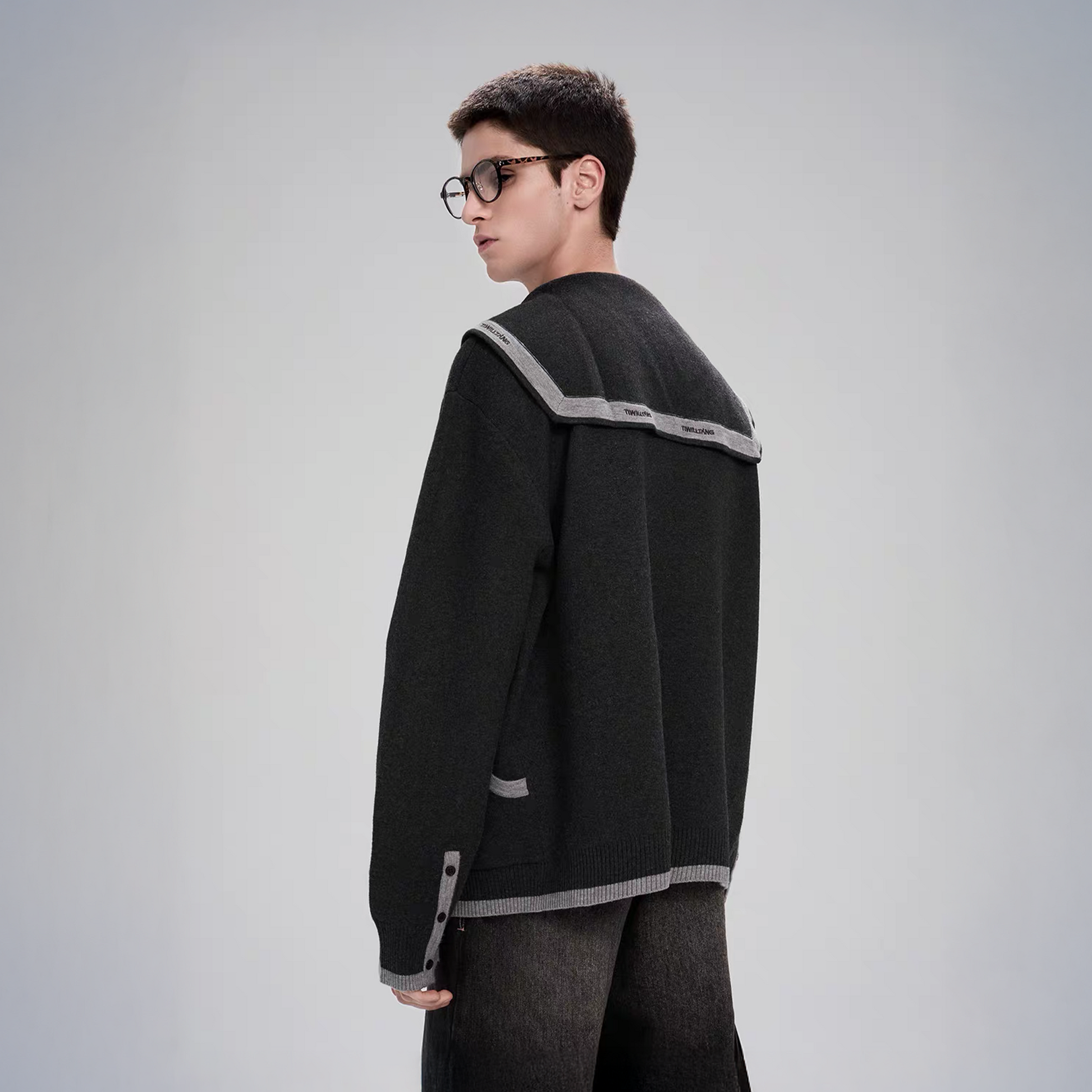 Blending collegiate nostalgia with street-forward detailing, the Contrast-Trim Sailor-Collar Jacket reimagines preppy sensibilities for the contemporary wardrobe. The oversized sailor-style collar anchors the silhouette, accented by bold contrast trim that outlines the zipper, sleeves, and hem with sharp precision. Rendered in a heavyweight knit fabric, the jacket balances structure with drape, making it a standout layering piece. The double-ended zipper and angular pocket design underscore its utilitarian edge, while subtle branding at the collar trim adds a refined touch.