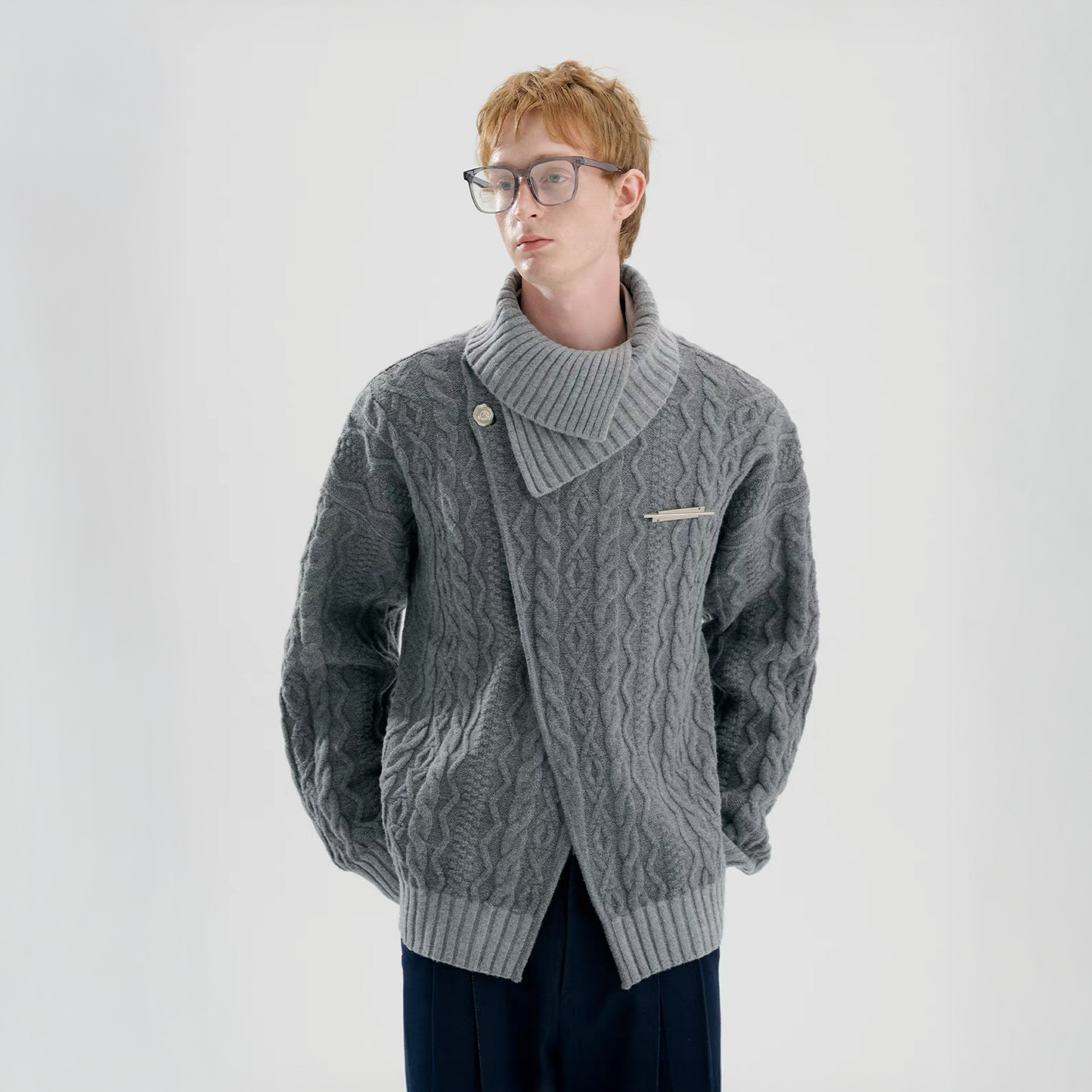 The Crossed Cable-Knit Shawl-Collar Cardigan reimagines classic knitwear through a bold, sculptural lens. Featuring a deep grey palette with an intricate cable-knit texture, the piece is defined by its asymmetrical front wrap and exaggerated ribbed shawl collar. A single crest button fastens the wrap design, while a metallic chest bar detail adds a modernist edge. Designed with a relaxed fit and dropped shoulders, it captures a refined yet unconventional mood that stands apart from traditional silhouettes.