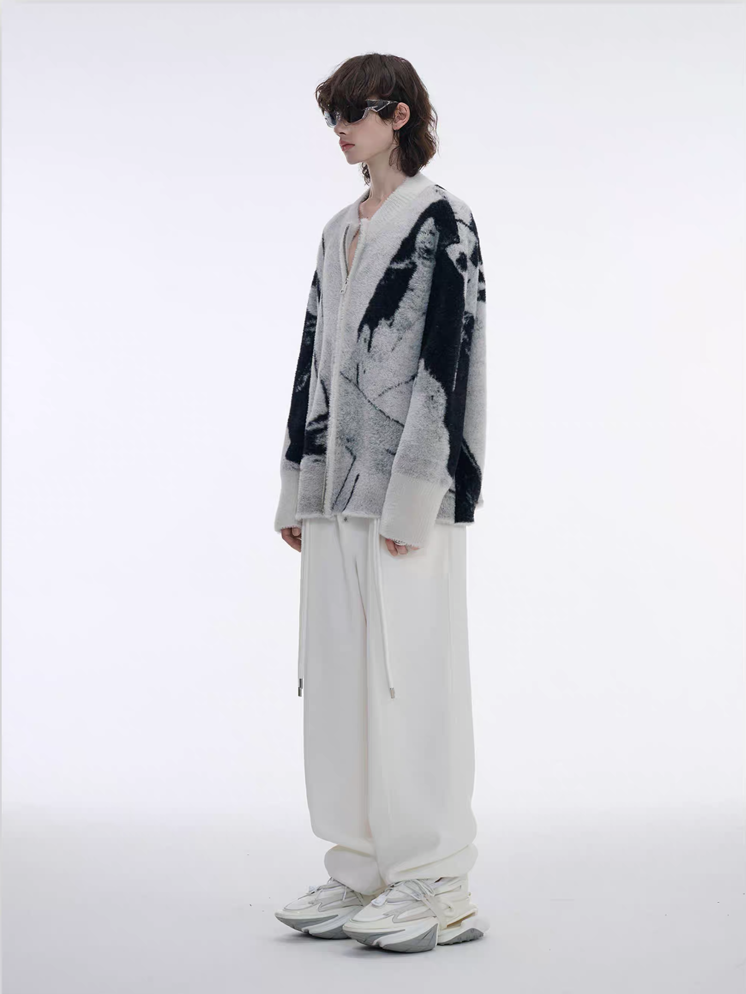The Faux-Mink Graphic Knit Jacket merges digital-age imagery with a plush, tactile finish, offering a bold reinterpretation of contemporary knitwear. Featuring a full-body jacquard print rendered in grayscale, the jacket evokes the look of distorted film stills or glitch art, wrapped in a faux-mink texture that softens its visual impact. Its relaxed silhouette is cut with dropped shoulders and secured by a double zipper, creating a seamless blend of softness and street-ready structure. With rib-knit detailing at the collar, cuffs, and hem, it delivers a subtle nod to classic bomber shapes reimagined through an avant-garde lens.
