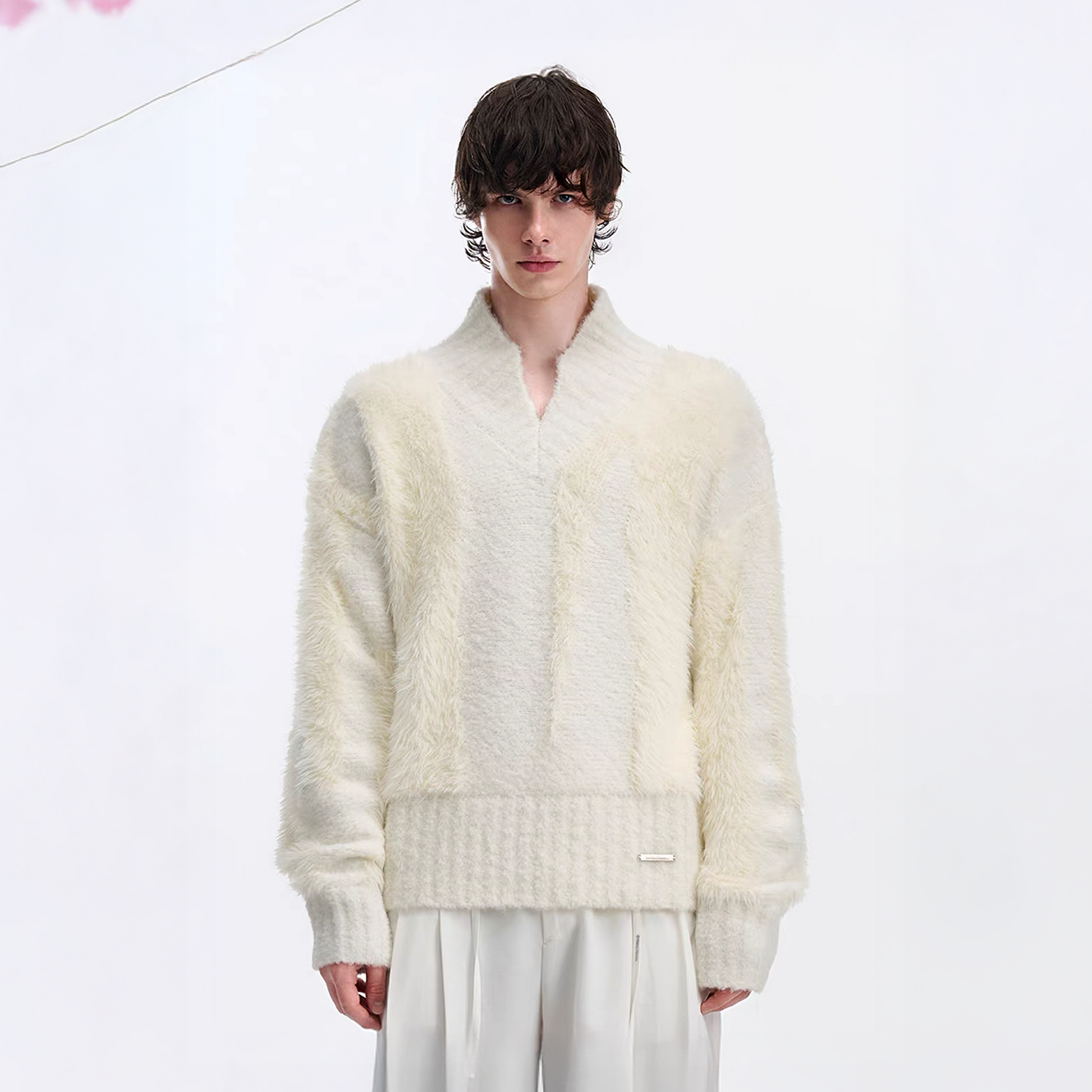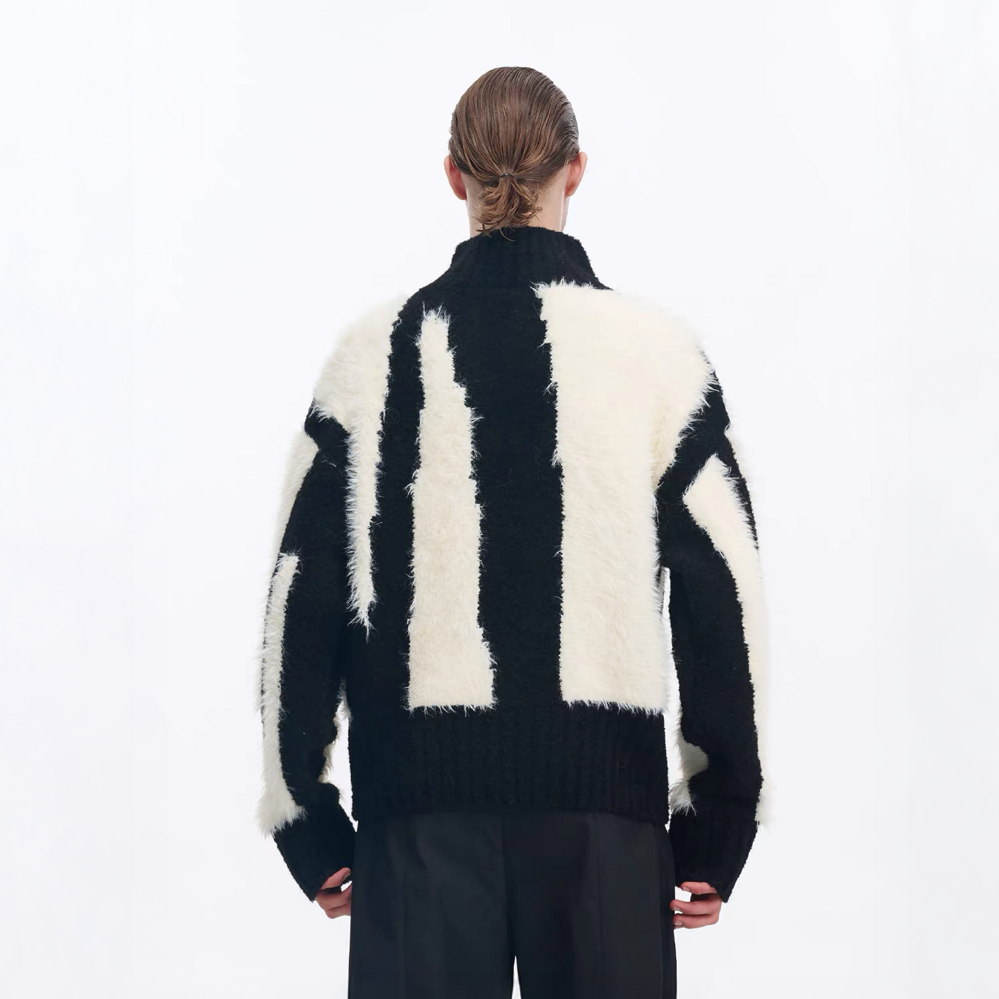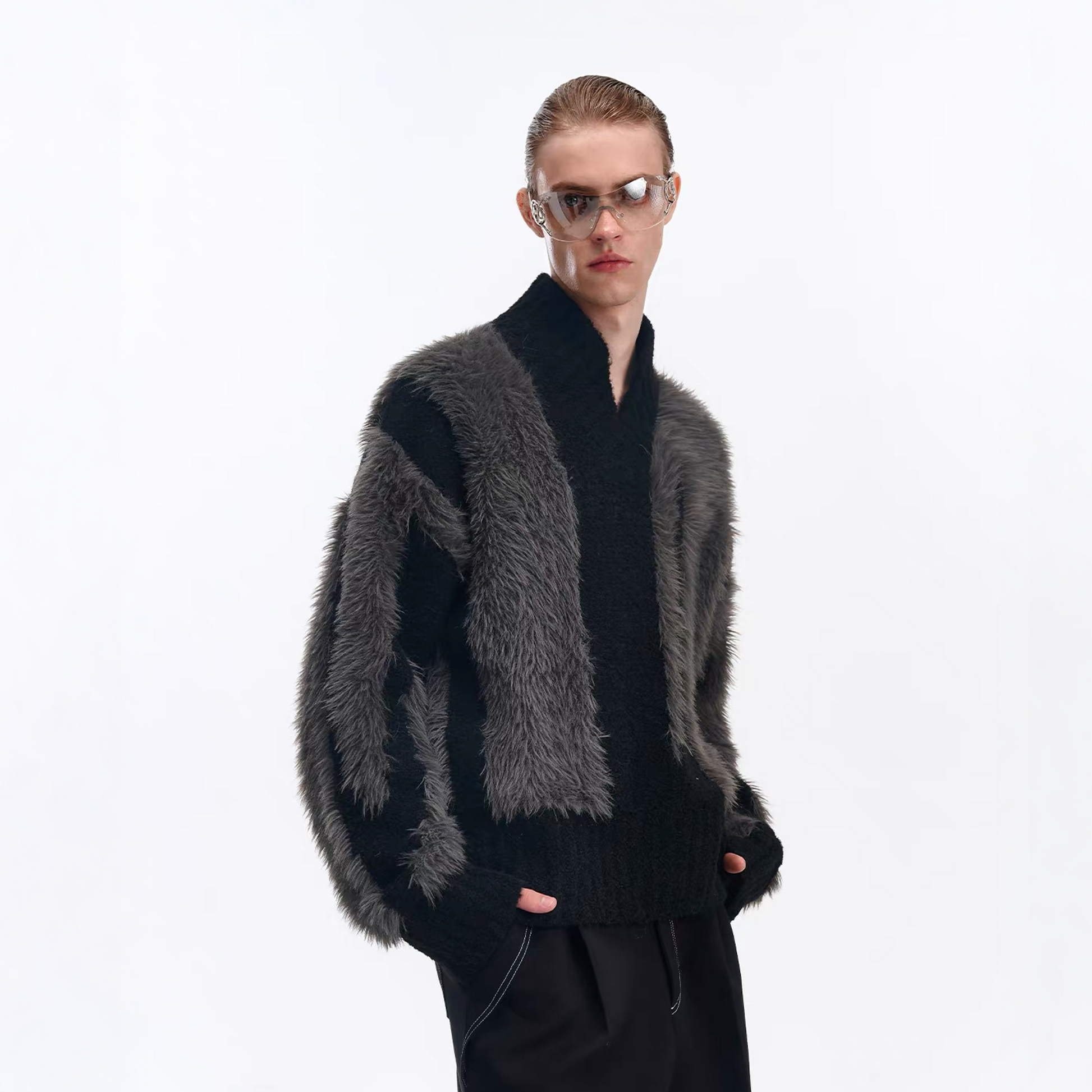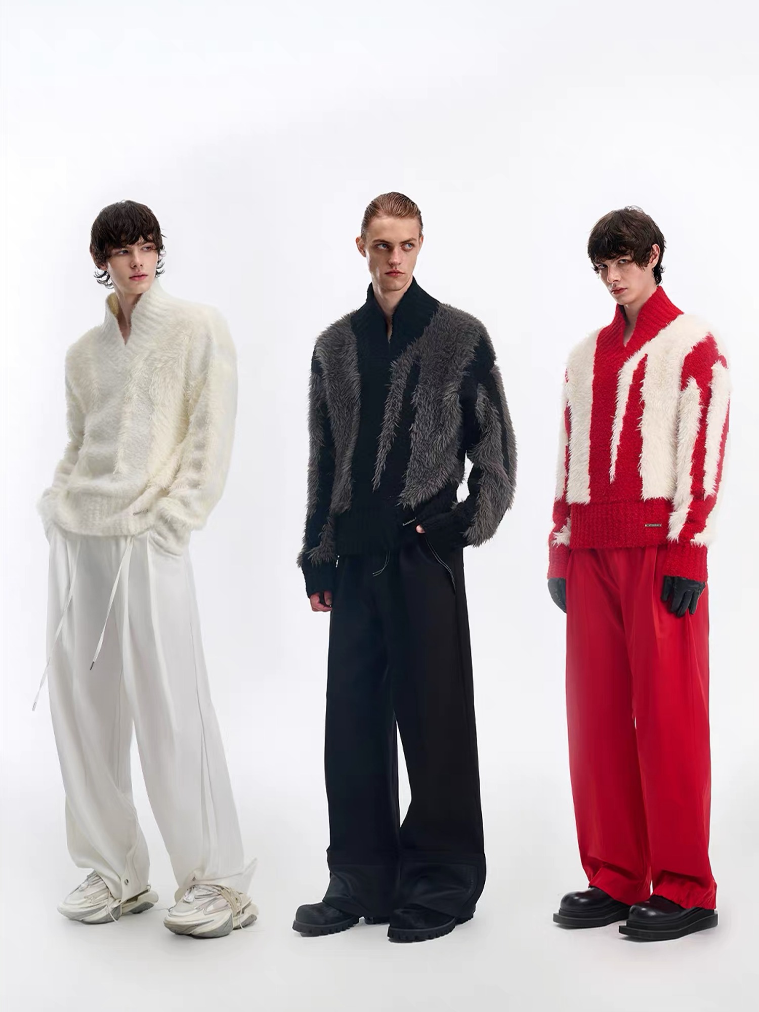 TIThe Fuzzy Faux-Mink Contrast Sweater delivers a bold visual punch with its jagged, abstract contrast panels and plush faux-mink texture. Designed with an exaggerated mock neckline and structured shoulders, this piece fuses cozy volume with sharp lines for a striking silhouette. Available in multiple high-impact colorways¡ªcharcoal/black, red/white, black/white, and monochrome cream¡ªeach version channels a graphic, street-inflected aesthetic. The sweater¡¯s unique textural composition is further elevated by its asymmetrical V-slit collar and ribbed hem detailing, offering a refined take on urban cold-weather staples.