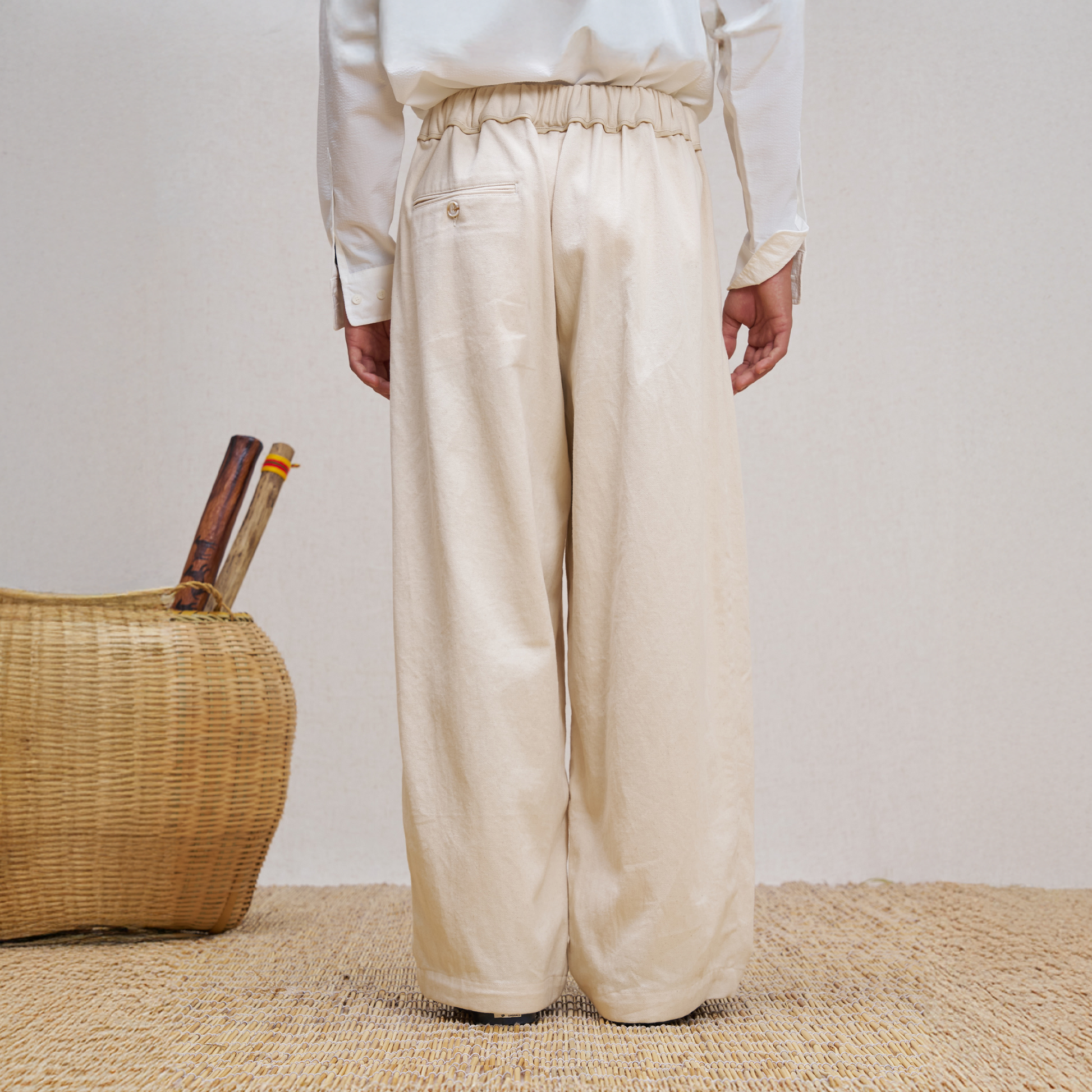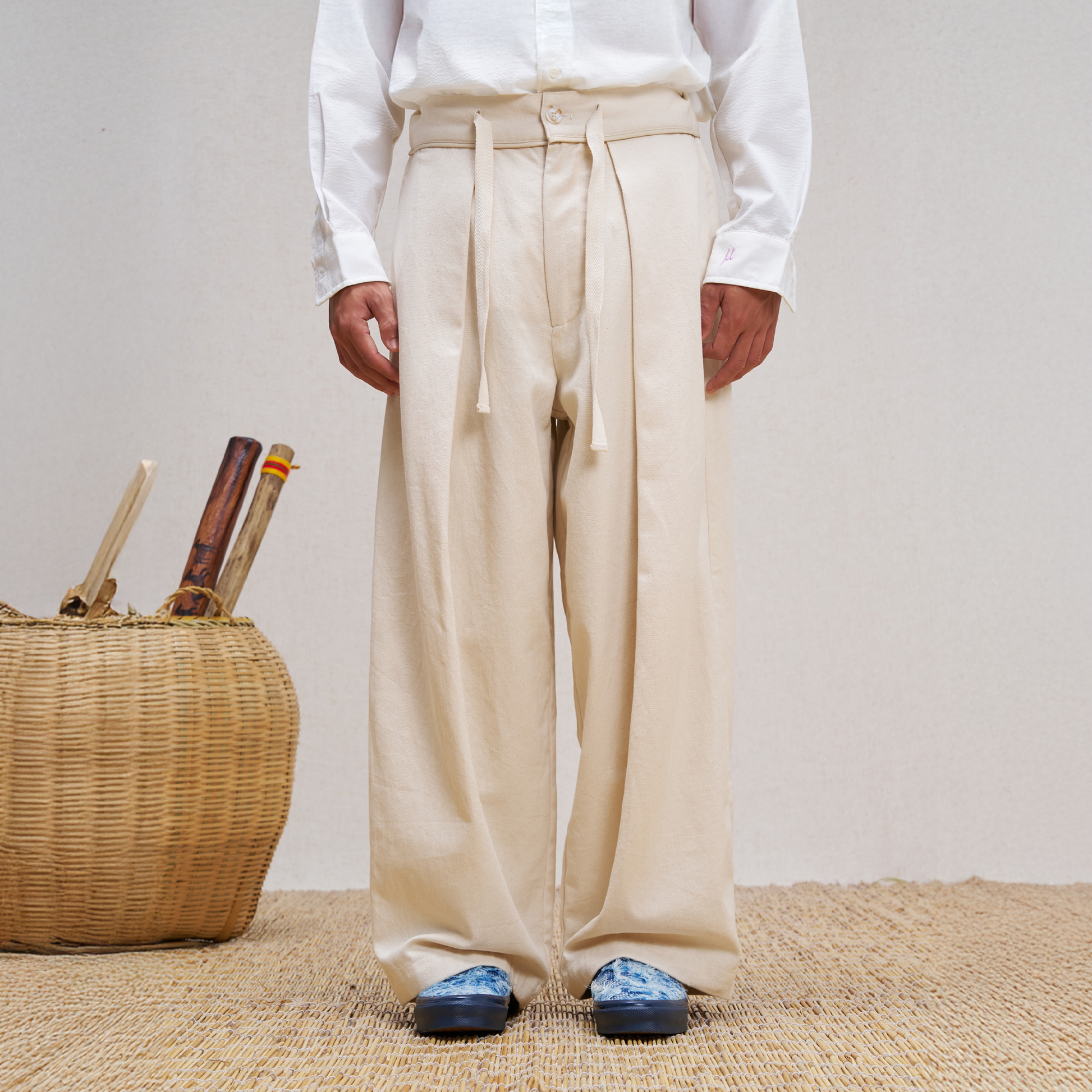 The?Pleated Herringbone Wide-Leg Trousers blend tailored structure with a relaxed drape, resulting in a silhouette that feels both sculptural and effortless. Cut from midweight cotton herringbone twill, the pants feature deep front pleats and a high-set waistband with integrated self-fabric ties. The exaggerated leg volume falls in clean vertical lines, emphasizing proportion through thoughtful minimalism. Offered in natural ivory and warm khaki, the design centers texture and form with restrained precision.