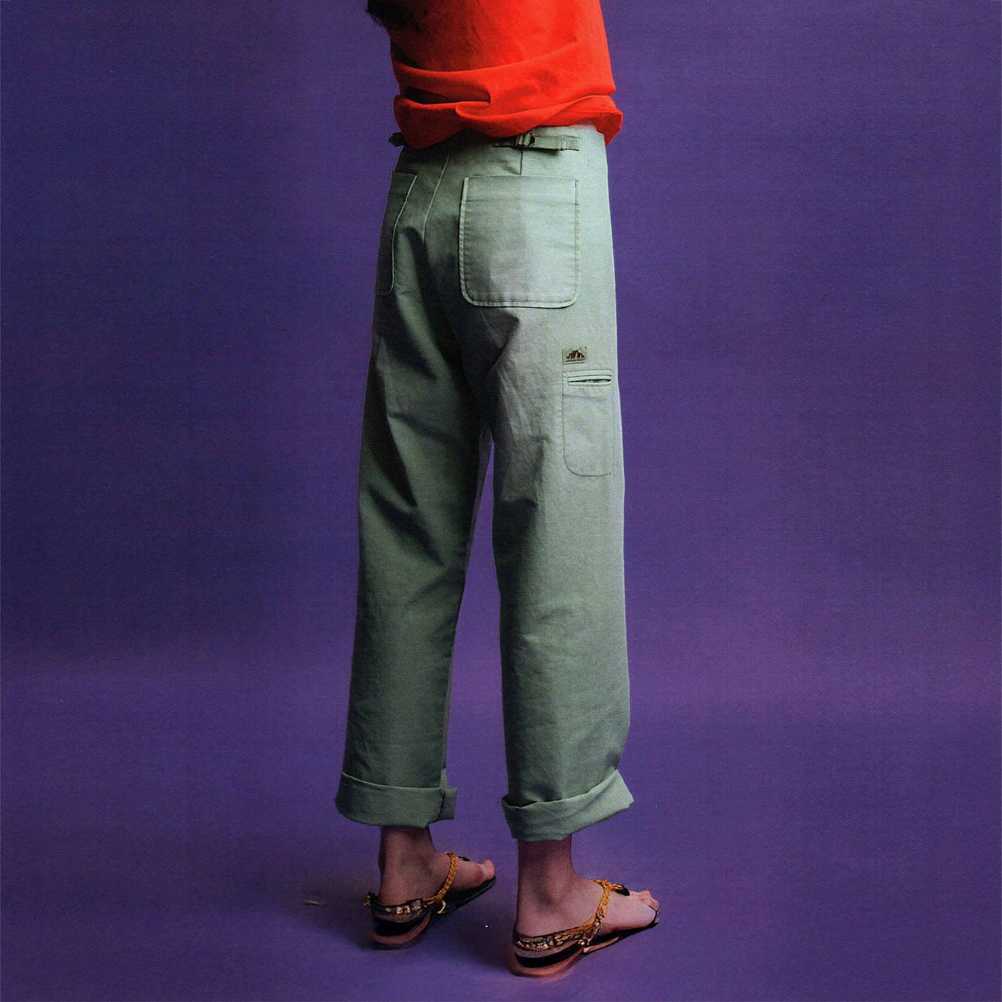 The Back-Strapped Washed Pants combine utilitarian influences with a relaxed, vintage-washed finish. Cut in a soft mint green tone, the trousers feature clean lines with workwear-inspired pocketing and visible seam detailing. A back-waist strap accent adds both visual structure and a nod to heritage military tailoring. The straight-leg fit and minimal hardware make this a versatile piece that bridges laid-back styling with functional edge.