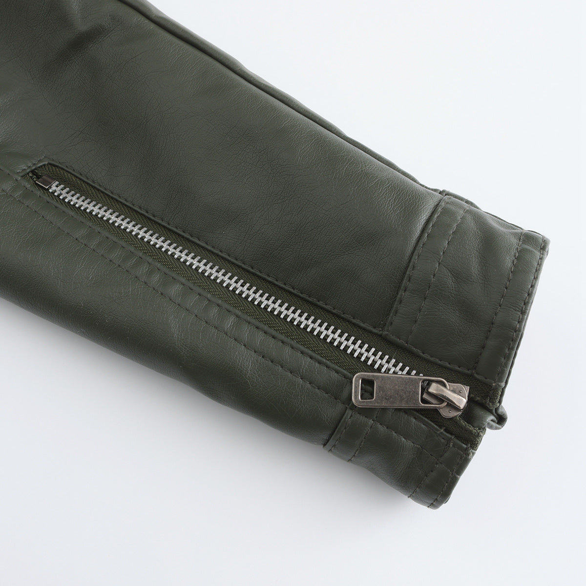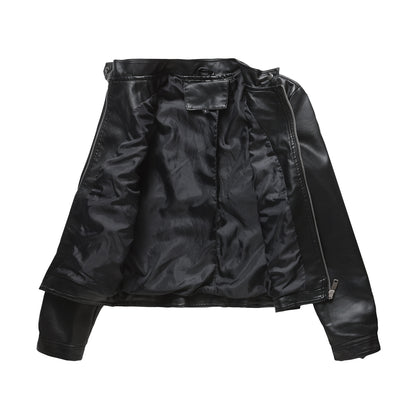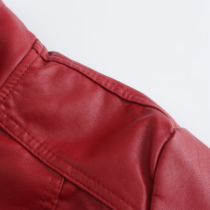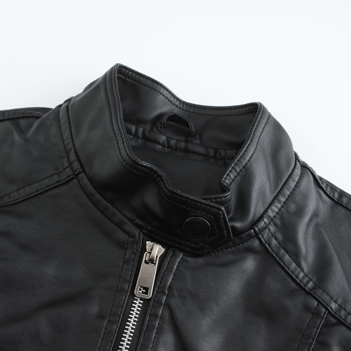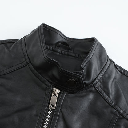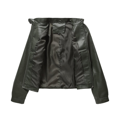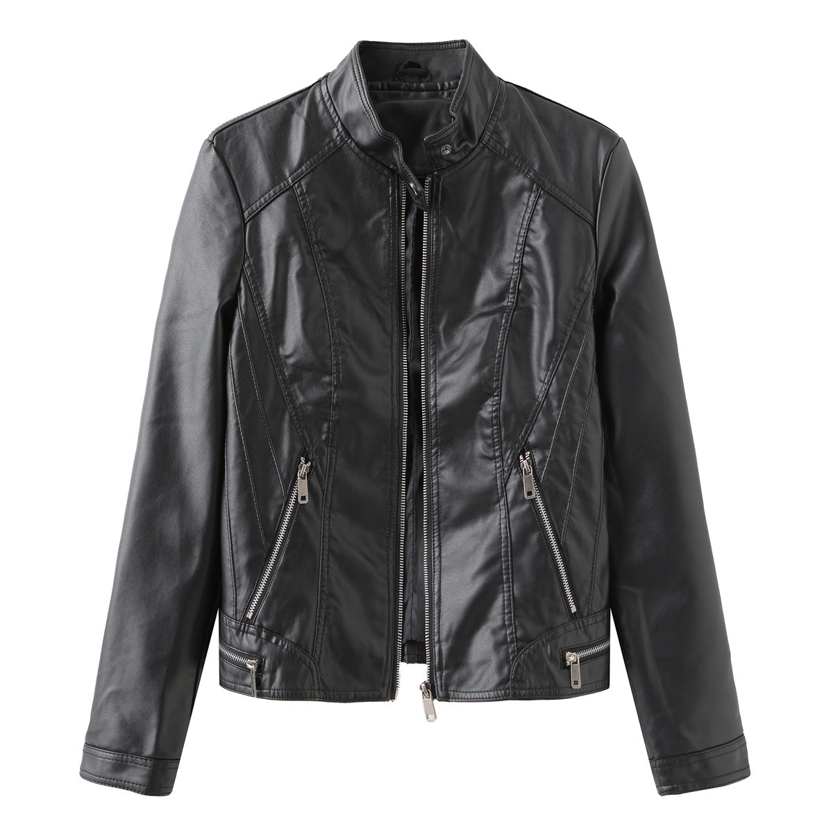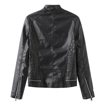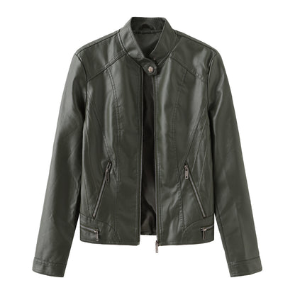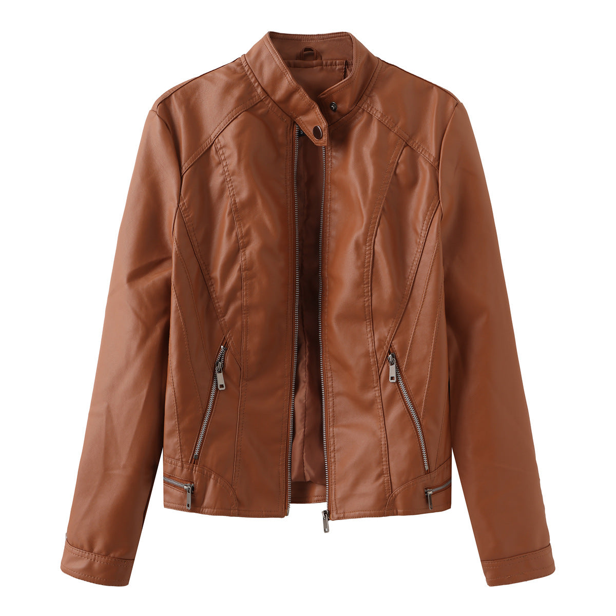 Women's Casual Leather Jacket – Long Sleeve Zip-Up Stand Collar Coat