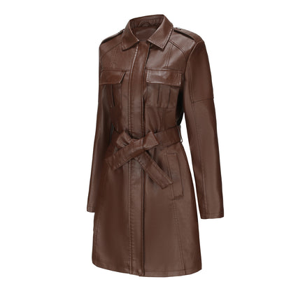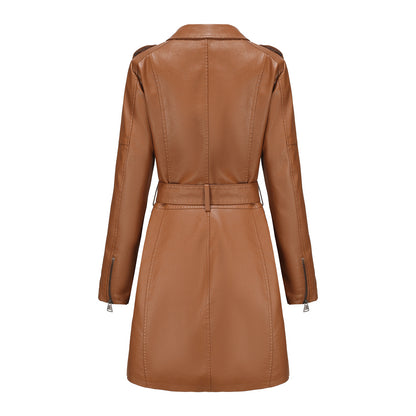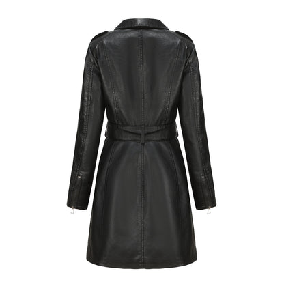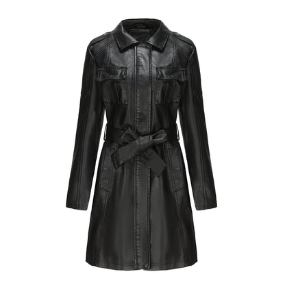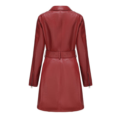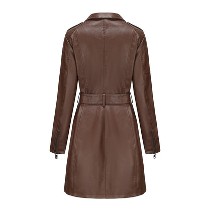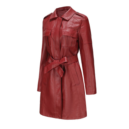 Elevate your wardrobe with this chic Women's Mid-Long Leather Trench Coat, designed to blend timeless elegance with modern sophistication. Perfect for spring and autumn, this belted leather jacket features a sleek silhouette, long sleeves, and a stylish waist-cinching belt to accentuate your figure.